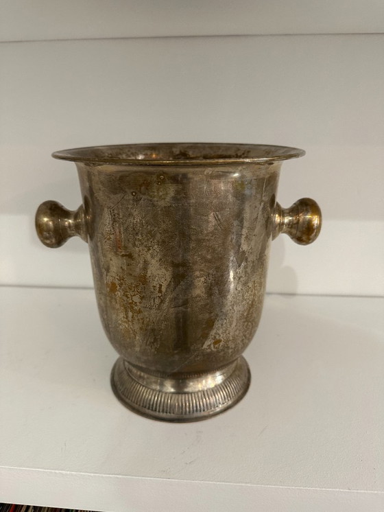 Élégant seau à champagne ou à vin en métal argenté, présentant une belle forme classique à anses boule latérales et base cannelée. Ce modèle respire le charme des grands hôtels et brasseries parisiennes, avec une patine visible qui lui confère authenticité et caractère.