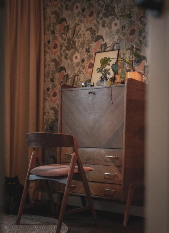 Ce magnifique secrétaire du milieu du siècle arbore une finition en bois brun chaleureux et d'élégantes poignées en laiton. Il offre un vaste espace de rangement avec trois tiroirs spacieux et un bureau rabattable, idéal pour un bureau à domicile ou un bureau d'étude. Les compartiments intérieurs permettent un rangement optimal pour vos essentiels. Ses lignes épurées et son style intemporel en font un meuble polyvalent qui s'intègre parfaitement à n'importe quelle pièce.