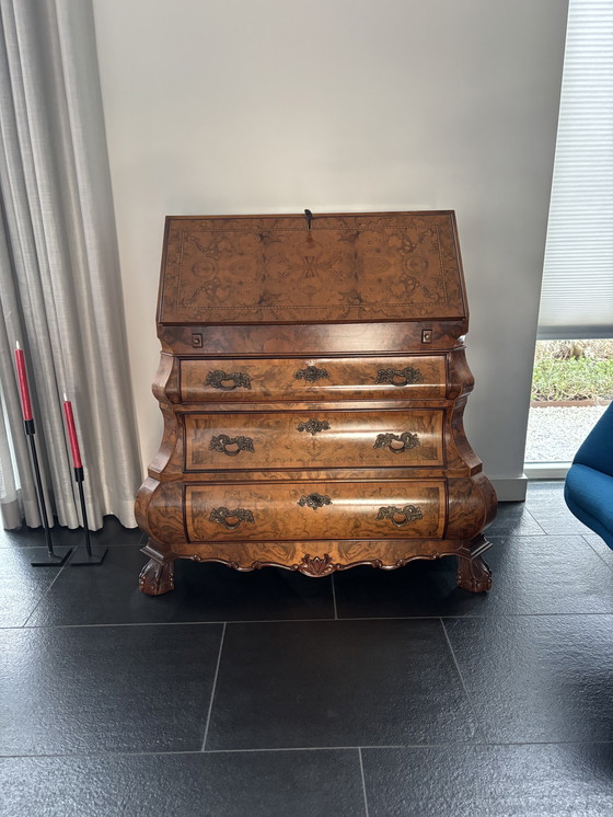 Ce secrétaire exquis, également appelé buikkast, témoigne d'une élégance intemporelle et d'un savoir-faire exceptionnel. Sa riche finition en bois brun et ses détails raffinés en font une pièce maîtresse dans tout intérieur sophistiqué.