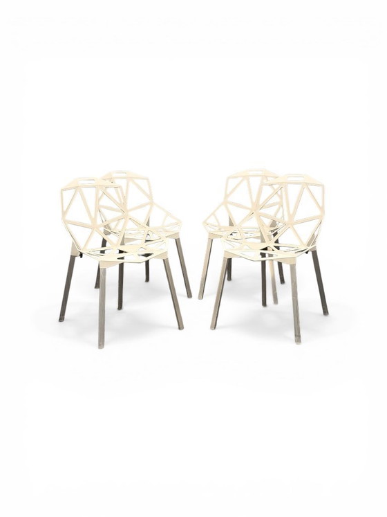 Acquérez une icône incontournable du design contemporain. Cette série de 4 chaises "Chair One", imaginée par Konstantin Grcic pour Magis, associe une structure géodésique en fonte d'aluminium blanc cassé à une patine industrielle authentique. L'ensemble parfait pour structurer une salle à manger ou une table de réunion exigeante.