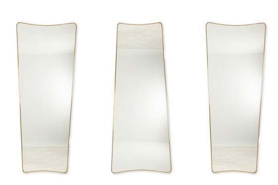 Série de 3 miroirs asymétriques, le miroir entouré d’un cerclage en laiton doré.