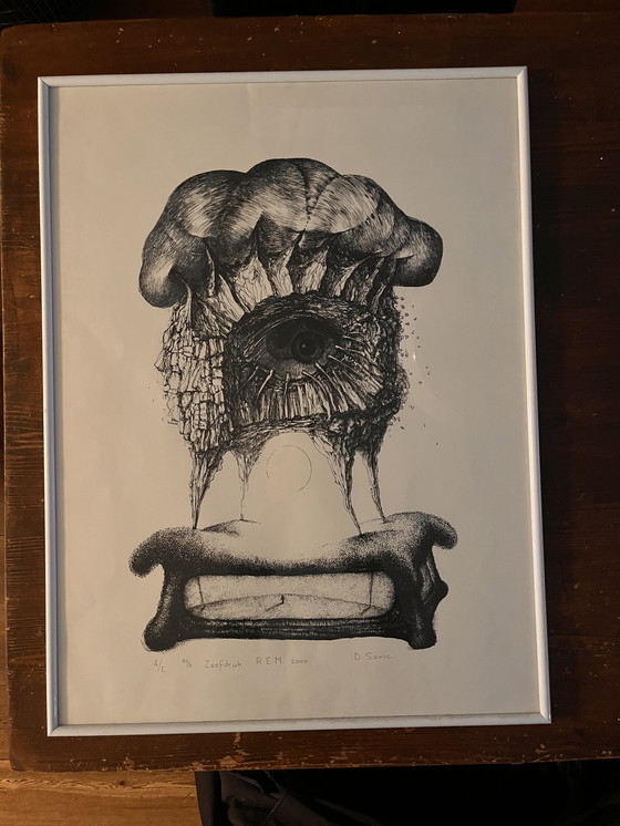 Cette œuvre est une sérigraphie de l'artiste D. Sovic, intitulée « R.E.M. 2000 ».