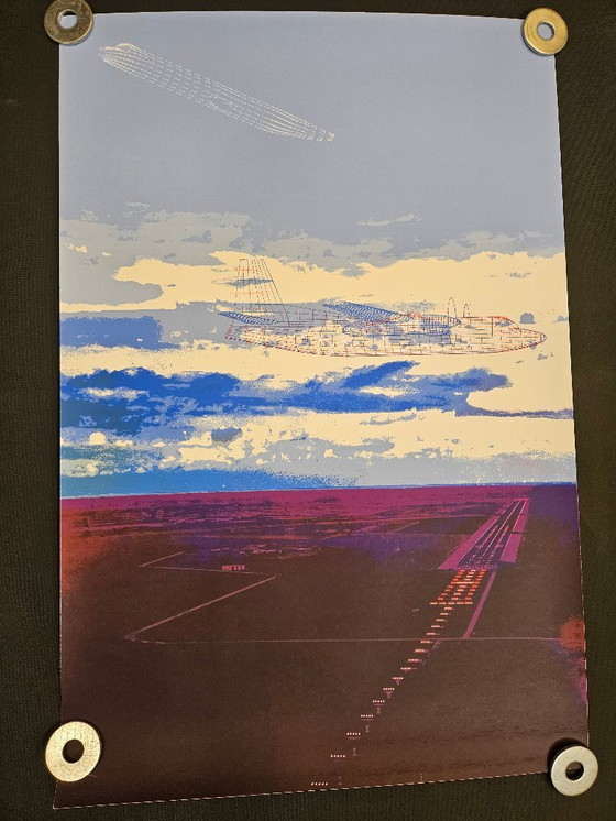 Découvrez le dynamisme de l'aviation avec cette impressionnante sérigraphie de Henk van der Vet. Imprimée sur papier épais, cette œuvre capture l'essence d'un avion à l'atterrissage dans un style abstrait et moderne. L'alliance des nuances de bleu, de violet et de brun crée un paysage visuellement captivant, empreint de sérénité et de mouvement.