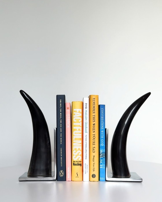 Serre-livres en corne de vache naturelle. Je ne sais pas s'il s'agit d'un style fermier ou s-a-t-a-n-i-c core, mais j'adore un bon ensemble de serre-livres, et ceux-ci sont vraiment cool 🔥 -pun intended-.