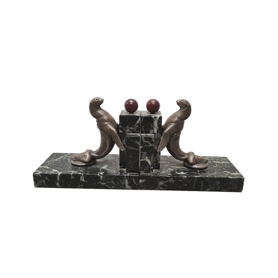 Serre-livres Art Déco Maurice Frecourt, circa 1925. Paire de magnifiques serre-livres décoratifs Art Déco, tous deux marqués Frecourt. Ils représentent deux lions de mer regardant un ballon. Les figurines sont en zinc et reposent sur des bases en marbre. Les deux ont des dommages mineurs aux coins du marbre (voir photos).