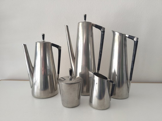 Service à café et à thé KMD Tiel Royal Holland Pewter des années 1960 avec pichet à eau, crémier et sucrier