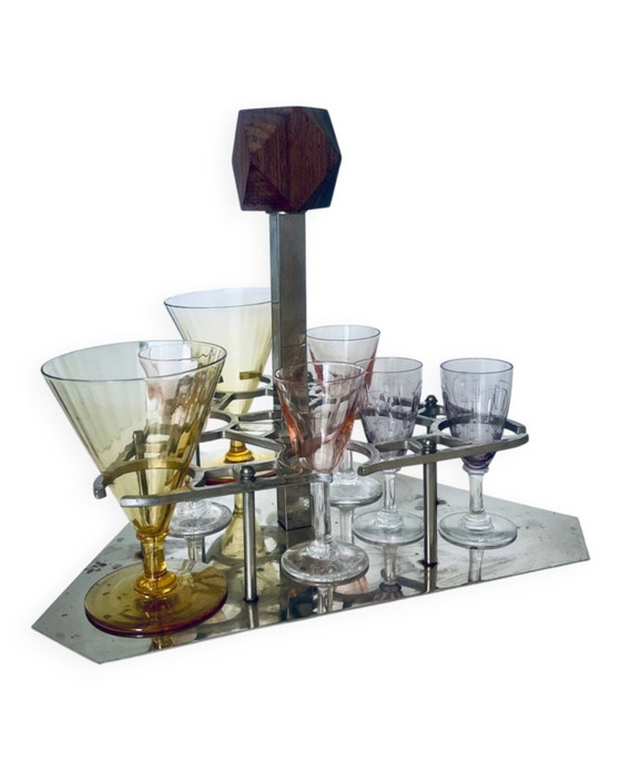 Ancien service à liqueur Art Déco avec 7 verres colorés et dépareillés en parfait état. Plateau triangulaire en métal argenté effet miroir, présentant quelques traces d'usure liées à l'âge. Poinçon estampillé LB sur le dessous. Hauteur 22cm, Largeur 22/26cm.