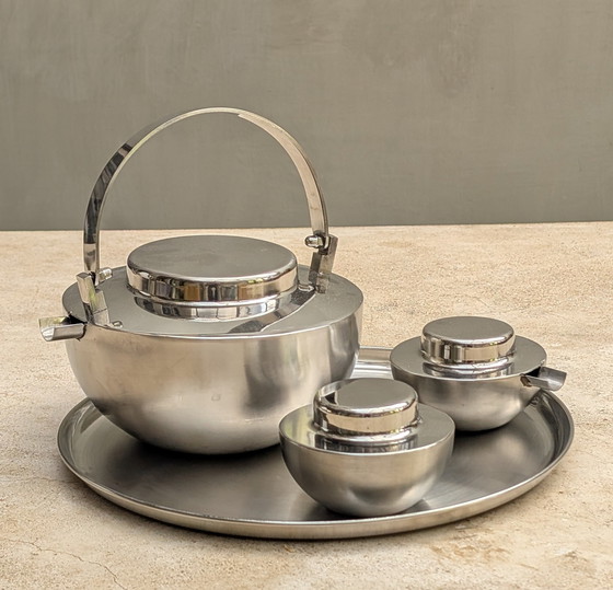 Ce magnifique service à thé en acier inoxydable de style Art déco est un ajout élégant à toute table de thé. Il se compose d'une théière, d'un sucrier et d'un pot à lait, le tout sur un plateau assorti. L'ensemble est fabriqué en acier inoxydable de haute qualité, ce qui lui confère un aspect durable et élégant. Idéal pour les amateurs de design vintage et parfait pour un usage quotidien ou pour les grandes occasions.