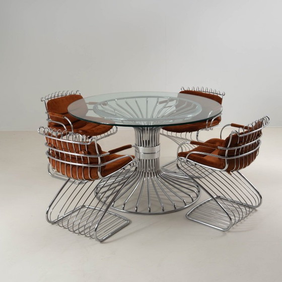 Cet ensemble sculptural est un bel exemple du design moderniste italien, alliant la légèreté des structures en fil de fer à la finesse des finitions chromées. Le piètement radial de la table lui confère une forte présence architecturale, tandis que les chaises reprennent la même structure rythmique en fil de fer, donnant à l'ensemble une allure harmonieuse et très décorative.