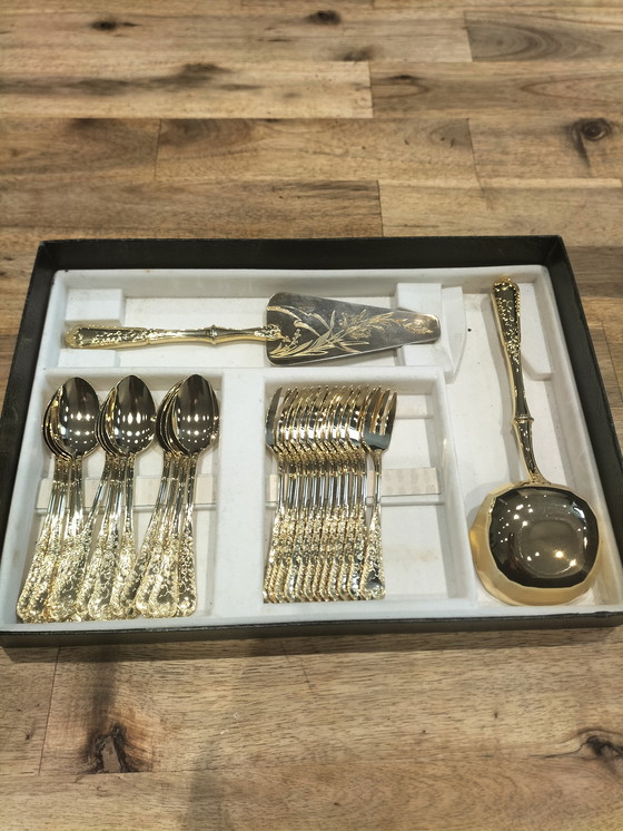 Découvrez l'élégance intemporelle de ce service en plaqué or 24 carats, une pièce maîtresse pour toute table raffinée. Chaque ustensile est soigneusement conçu pour offrir une expérience culinaire luxueuse et sophistiquée.