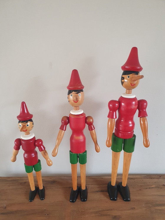 Bel ensemble de 3 Pinokios vintage. Le petit mesure 41 cm de haut, le moyen 51 cm et le grand 58 cm. A vendre séparément : petit 25,-, moyen 40,-, grand 55,-.