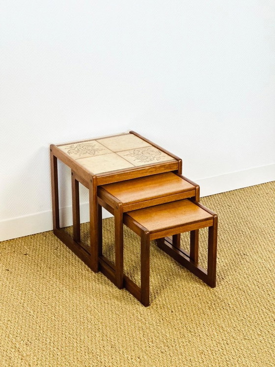 Set de 3 tables basses gigognes vintage en teck et céramique, 1960