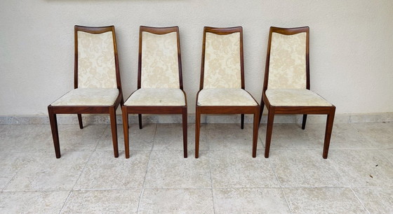 Ces chaises présentent une élégante structure en bois massif de teck, typique de la période, avec un dossier haut légèrement incurvé offrant une excellente ergonomie et un style raffiné.
