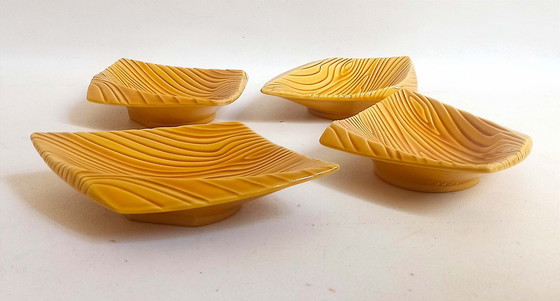 Set de 4 coupelles (ramequins) céramique française estampillée Verceram N° 4577. Moutarde effet strié. Parfait état. Dimensions d'un ramequin: Largeur 23,4 cm, Profondeur 18 cm, Hauteur 4,5 cm. Parfait état. Poids du lot hors emballage 2,9 kg. Emballage soigné. Envoi suivi.