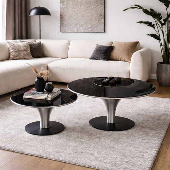 L'élégant ensemble de tables basses Ovni Up de Roche Bobois se compose de deux tables rondes de 70 et 90 cm de diamètre. L'alliance du plateau en verre et du piètement sculptural confère à l'ensemble une allure moderne et architecturale. Les tables sont en parfait état et sont fournies avec leurs ventouses d'origine permettant de retirer le plateau en verre en toute sécurité pour le nettoyage. Proposé en ensemble, également disponible séparément.