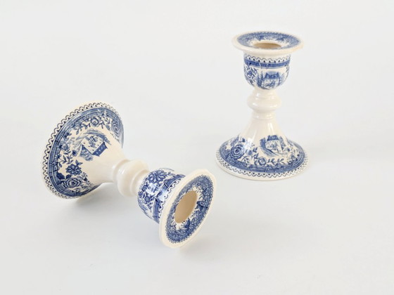 Set of 2 Antique Villeroy & Boch Burgenland Candleholders | Blue Saar Transferware (1913–1947)