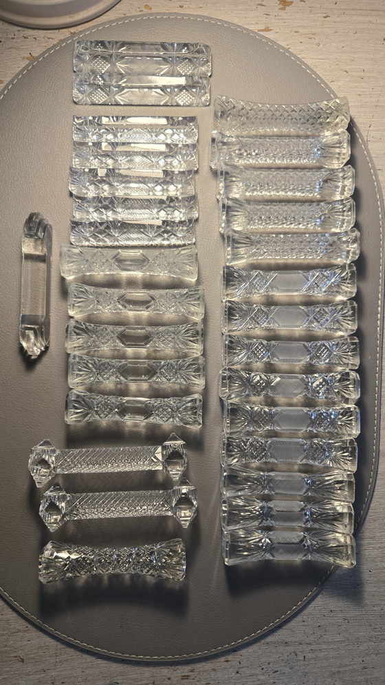 Voici des repose-couteaux en cristal (je crois qu'il y en a 10 !) et en verre, un accessoire de table classique du XIXe et du début du XXe siècle, conçu pour protéger la nappe pendant les repas.