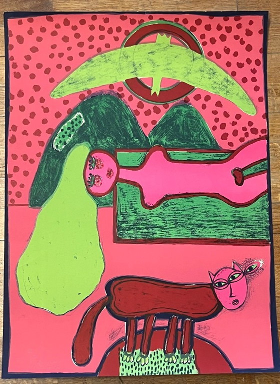 Exemplaire d'artiste avec tampon Atelier Corneille au dos. Tirage commercial à 100 exemplaires Oeuvre rare et peu courante. Grande lithographie originale du peintre Guillaume Corneille (1922-2010), né à Liège de parents Néerlandais, membre fondateur du mouvement Cobra. Dimensions totales : 76 x 55,8 cm - Signée et datée au graphite de la main de l'artiste Très bon état avec dos piqué et jauni. Prévoir à encadrer - Envoi sécurisé avec assurances par UPS Grand Maître de la couleur dans le sillage de Gauguin et Matisse, Guillaume Corneille crée un monde jovial emprunt d'exotisme. Artiste voyageur, Corneille, grâce à son ami Alan Davie, croise David Hockney sur la scène Londonienne. Tous deux peintres érudits, ils ont ce même goût de la couleur, ce sens de simplification du trait et cette même constance à faire des clins d'oeil à l'histoire de l'art des siècles passés et à leur propre histoire.