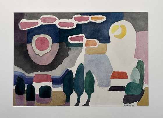 Aquarelle de l'artiste bien connu Dinieks. Titre : Le soleil à côté de la lune. Dimensions à l'intérieur du passe-partout : 48.5x34cm. Dimensions à l'extérieur du passe partout : 70x50cm. Vendue par les héritiers après sa mort.