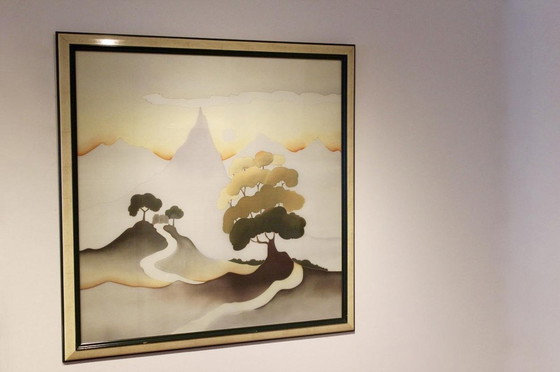 Beautiful 80s Aquarelle painted on Silk, called ‘Soleil Couchant’ which means ‘Sunset’. This sophisticated artwork is hand-painted and hand-signed by Odille Penelle in France. Painted in beautiful colors with sand, lilac and brown as basic colors. Professionally framed in a heavy green and cream lacquered wooden frame. The painting comes from an art collector and is in very good condition. We have another matching aquarelle on silk available in another listing.