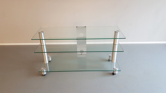 Meuble TV/audio design en verre du fabricant Spectral. Un design épuré et beaucoup d'espace pour la télévision, l'audio et les accessoires. Le passe-câble en aluminium peut être déplacé à volonté ou entièrement retiré. Voir les photos 1 et 2. Le meuble peut également servir de table d'appoint, de bibliothèque, etc. Il n'y a pas une seule éraflure ou dommage. L'étagère est déjà démontée et les étagères en verre, les pièces d'assemblage et les roulettes sont emballées séparément dans du papier bulle afin qu'elles soient légères à soulever et qu'elles puissent être transportées sans dommage. Le montage est simple mais des instructions succinctes peuvent être fournies à l'acheteur si nécessaire.