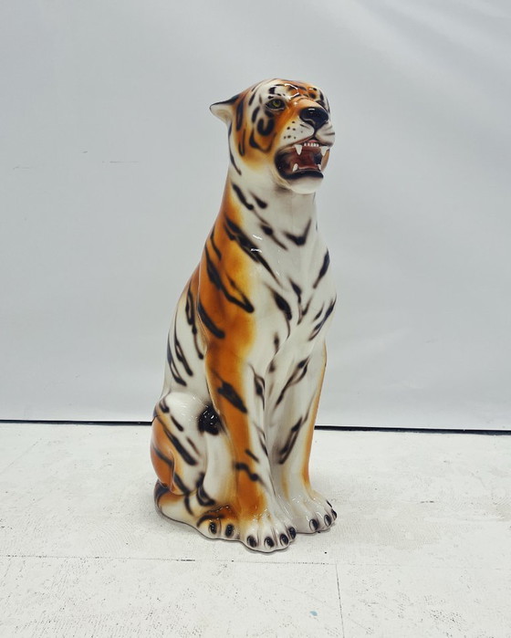 Statue de tigre unique, entièrement réalisée à la main. Cette statue de style Hollywood Regency, en céramique peinte à la main et fabriquée en Italie, apportera une touche d'élégance et de caractère à votre intérieur !