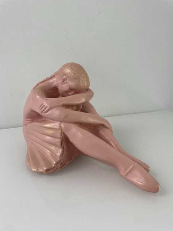 Sculpture figurative représentant une danseuse de ballet assise. Réalisée en pierre tendre rose, elle est rehaussée de subtiles touches dorées.