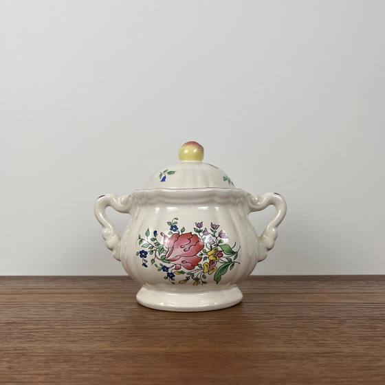 Ce sucrier en faïence fine de la célèbre manufacture de Lunéville, datant de 1887, présente le décor caractéristique "Réverbère", avec ses délicats motifs floraux et ses couleurs vives.