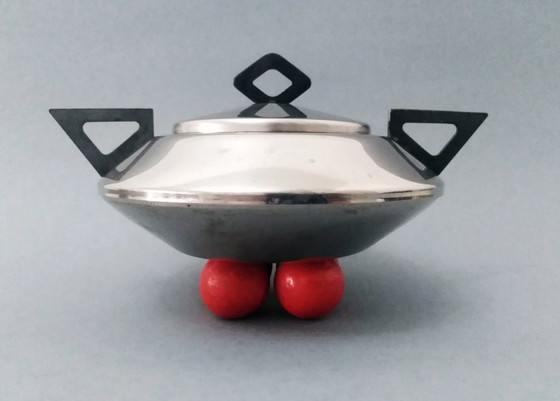 Sucrier en métal Space-age/postmoderne avec couvercle sur 4 boules rouges sur pieds 1980 -- 16x10cm avec des usures minimes en parfait état--shipping in EU - 25€ worldwide - 55€ SHIPPING with priority express and registered post En tant que vendeur privé, je serai responsable de tout dommage à votre marchandise qui pourrait être causé par un emballage défectueux. Je ne suis pas responsable des dommages causés par la faute du transporteur, ni des colis perdus, etc. Selon les lois en vigueur dans l'Union européenne, la responsabilité de la livraison incombe à l'acheteur.