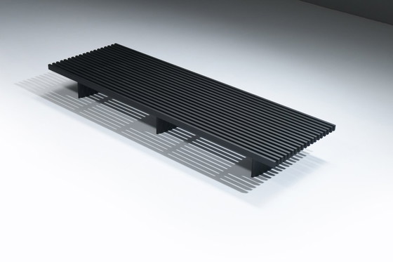 Le Refolo est composé de 19 lattes parallèles en chêne teinté noir, créant une surface rythmée et graphique où structure et esthétique s'unissent harmonieusement. Les supports en bois massif confèrent à la pièce une forte présence architecturale tout en préservant sa légèreté visuelle. La construction est sobre et lisible, sans éléments superflus.