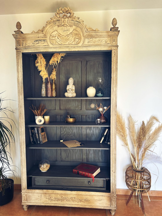 Coup de cœur assuré pour cette superbe armoire / bibliothèque patinée façon toscane, pleine de charme et de caractère.