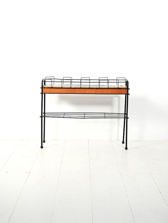 Ce porte-plantes scandinave des années 1960-1970 présente une structure fine en métal laqué noir associée à des incrustations chaleureuses en teck. Son design repose sur des lignes géométriques épurées et des proportions légères, complétées par une étagère inférieure offrant un espace de rangement supplémentaire. Le bac amovible en acier est conçu pour recueillir discrètement l'excès d'eau. Objet typique du design nordique, il allie fonctionnalité et esprit rationnel à une élégance décorative discrète.