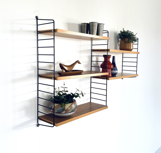 3 étagères en forme d'échelle revêtues de noir qui se fixent facilement au mur à l'aide de 3 vis. L'étagère murale a 5 tablettes en teck qui tombent dans les tablettes. Un bel accroche-regard sur votre mur pour présenter vos plus beaux objets. En bon état d'usage, sans dommage. Bel objet.