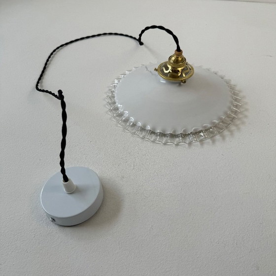 Ancienne suspension vintage en opaline dentelée. Belle lumière. Quelques traces du temps.