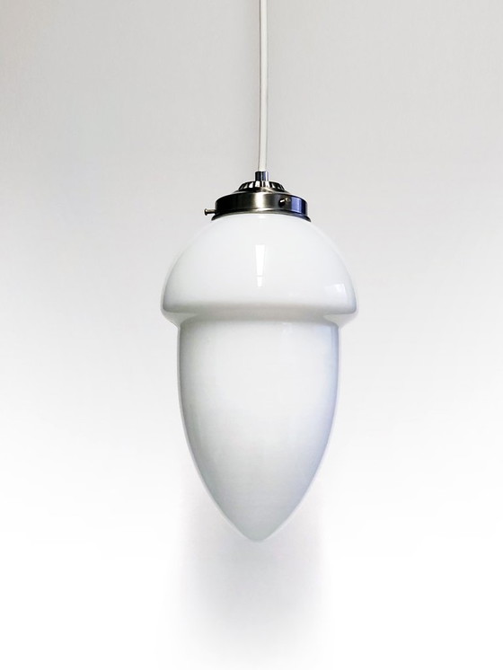 La lampe est en verre opalin blanc avec un abat-jour en métal nickelé.