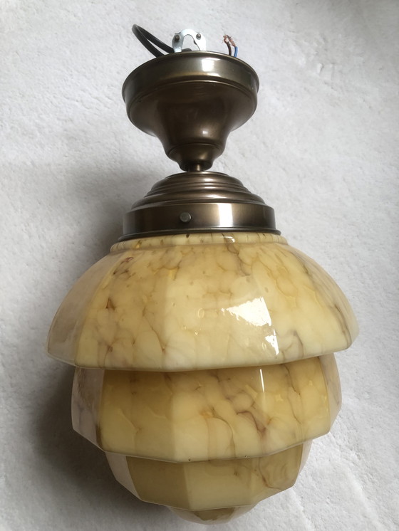 Cette suspension Art déco en verre marbré est un magnifique ajout à tout intérieur. Son design unique capture l'essence de l'époque Art déco, offrant à la fois élégance et une touche de charme vintage. Parfaite pour diffuser une lumière chaleureuse dans votre salon ou votre salle à manger.