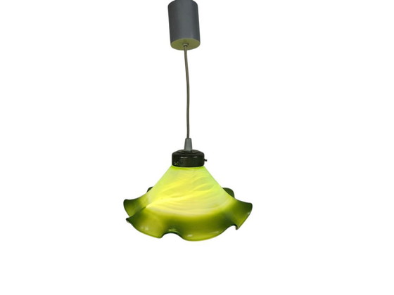 Fabriqué en verre opalin vert, avec un intérieur blanc pour une meilleure diffusion de la lumière.