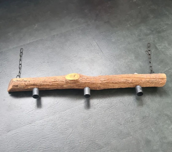 Suspension artisanale unique, fabriquée à partir d'un tronc d'arbre robuste. Dotée de trois points lumineux, elle offre une lumière douce et naturelle dans n'importe quelle pièce. Idéale au-dessus d'une table à manger, dans un salon ou pour une décoration rustique. La texture naturelle du bois rend chaque lampe unique.