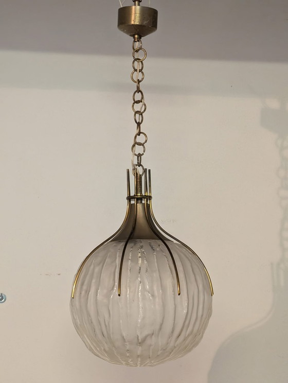 Ce plafonnier a été créé par le célèbre artiste et designer italien Angelo Brotto et produit par la société italienne d'éclairage Esperia dans les années 50. La lampe est fabriquée en laiton et en verre satiné gravé à l'acide. Elle mesure 47 cm de haut. Mais avec la chaîne en laiton qui suspend la lampe au plafond, la hauteur totale de la lampe est de 80 cm. L'objet est conservé en bon état. Le prix d'expédition indiqué est approximatif. Les frais d'expédition sont à la charge de l'acheteur et varient en fonction du type et des dimensions de l'objet, ainsi que de la distance parcourue par le transporteur.