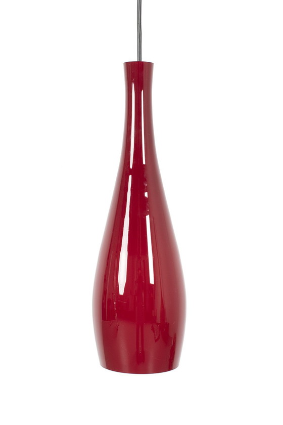 Suspension de Jacob E. Bang, conçue pour la marque danoise Fog & Mørup dans les années 1960-1970. Elle est en verre opalin blanc avec un revêtement extérieur en verre rouge transparent, offrant ainsi une belle lumière diffuse. Sa forme est élégante et subtile. Le verre opalin intérieur présente deux petits éclats, mais la lampe est par ailleurs en bon état vintage.