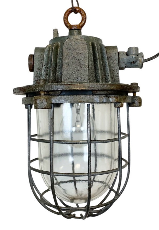 Suspension industrielle fabriquée par Elekrosvit en ex-Tchécoslovaquie dans les années 1960. Elle est composée d'un abat-jour en fonte, d'un diffuseur en verre transparent et d'une grille en fer. La douille en porcelaine est compatible avec les ampoules standard E27/E26. Câble neuf. Poids : 9 kg.