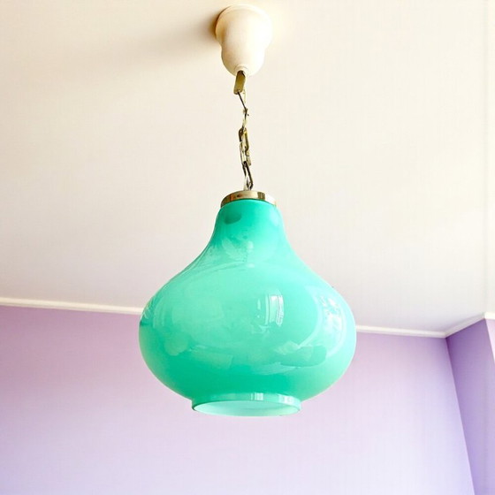 Cette suspension vintage en forme de poire est fabriquée dans un verre opalin turquoise rare. Elle est équipée d'un mécanisme de suspension neuf en métal et plastique des années 1980, déniché en Ukraine.