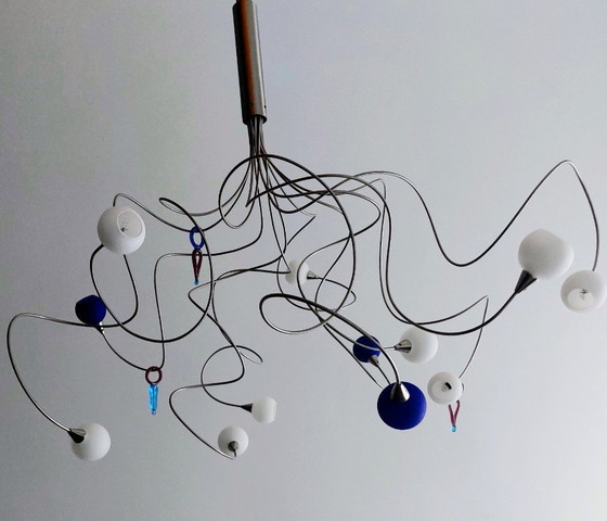Suspension Harco Loor (ou similaire). 12 ampoules de 10 à 20 watts (9 blanches, 3 bleues) et supports en verre. Intensité variable pour une lumière douce et chaleureuse.