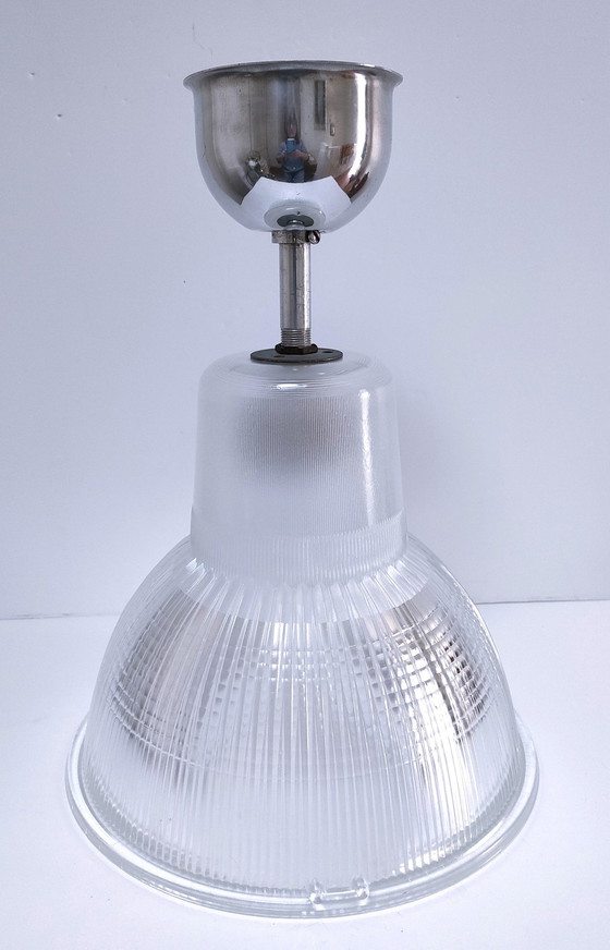 suspension design industriel verre holophane (marque holophane présente en relief sur le pourtour du verre (voir photos et zoomer). travail milieu xxème. très bel état d'ensemble. très rares traces d'usage courantes par endroits (voir photos et zoomer). noter que la suspension est dépourvue de capot (voir photos et zoomer). le diamètre total du verre est de 27 cm à l'ouverture. la hauteur totale de la suspension est de 38 cm. fonctionne avec une ampoule à vis gros culot non fournie.