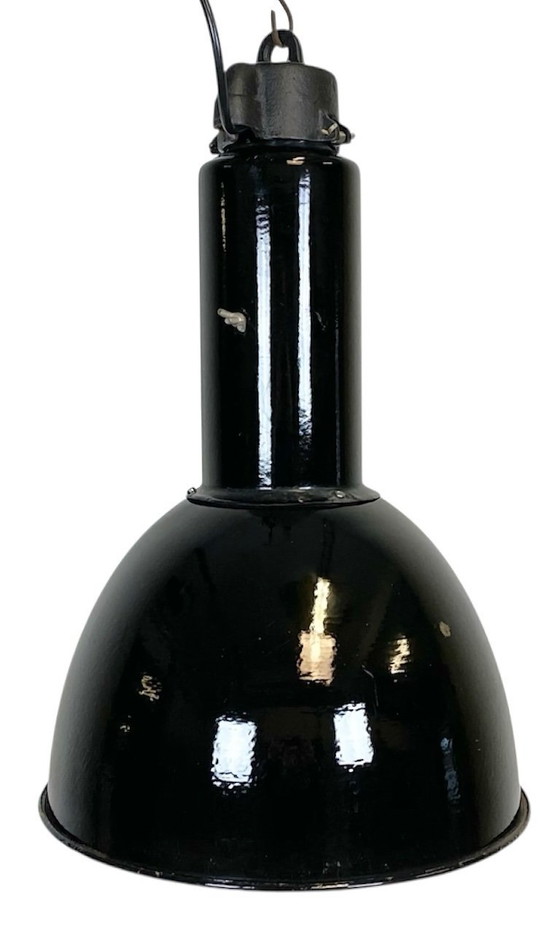 Suspension industrielle en émail noir, fabriquée par Elektrosvit en ex-Tchécoslovaquie entre 1930 et 1970. Design inspiré du Bauhaus. Intérieur de l'abat-jour en émail blanc. Partie supérieure en fonte. Douille en porcelaine neuve compatible avec les ampoules standard E27/E26. Câble neuf. Entièrement fonctionnelle. Poids : 2,9 kg. Diamètre de l'abat-jour : 34 cm.