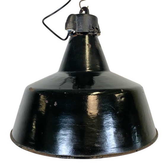 Lampe industrielle vintage en émail noir, fabriquée par Elektrosvit en Tchécoslovaquie dans les années 1970. Intérieur en émail blanc. Abat-jour en fonte. Douille en porcelaine neuve, compatible avec les ampoules standard E27/E26. Câble neuf. Poids : 2,5 kg. Diamètre de l’abat-jour : 40 cm.