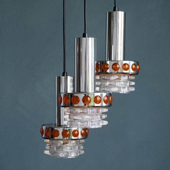 La lampe se compose d'un corps cylindrique chromé entouré d'un anneau d'éléments en plastique orange chaud. À sa base, une magnifique pièce de verre crée un jeu de lumière unique.