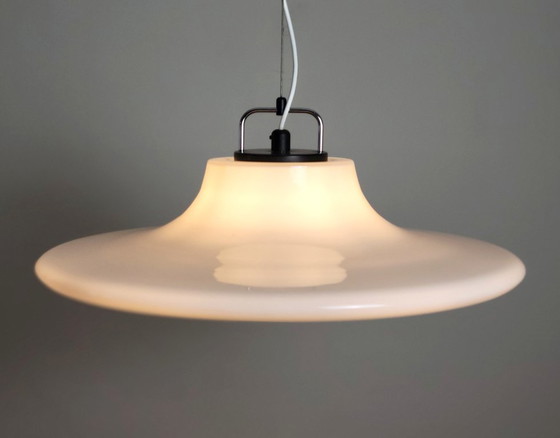 Suspension OVNI de grande taille, modèle Cirrus, de la marque allemande Peil & Putzler (1970). Fabriquée en verre de Murano blanc, elle diffuse une lumière douce et agréable. Compte tenu de ses dimensions et de son poids, elle est fixée par un câble en acier. Équipée d'une douille E27 en aluminium, elle porte une marque. Son état est excellent, surtout pour son âge.