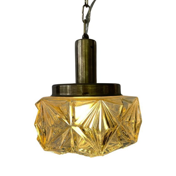 Cette suspension vintage est un exemple raffiné du design du milieu du XXe siècle, où les matériaux et les détails sont mis en valeur. La structure en laiton s'harmonise parfaitement avec l'abat-jour en verre, orné d'un subtil motif géométrique. Le verre ambré diffuse une lumière chaude, créant une ambiance douce et feutrée.