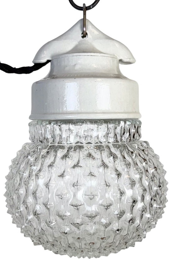 Lampe industrielle vintage fabriquée en ex-Tchécoslovaquie dans les années 1970. Elle est composée d'un abat-jour en porcelaine blanche et d'un diffuseur en verre. La douille est compatible avec les ampoules standard E27/E26. Câble neuf. Poids : 1 kg.